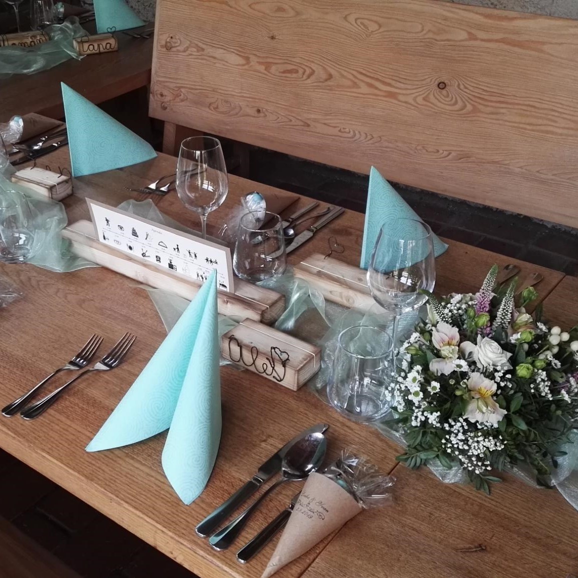 Stejně jako v případě jmenovek se dřevěným stojánkem, které vznikly na základě nápadu nevěsty Lenky. Výsledná svatební tabule vypadala krásně a všechny detaily spolu perfektně ladily. Ke jmenovkám se stojánkem byl ještě jeden, delší, kde byly fotky novomanželů a jejich jména.
