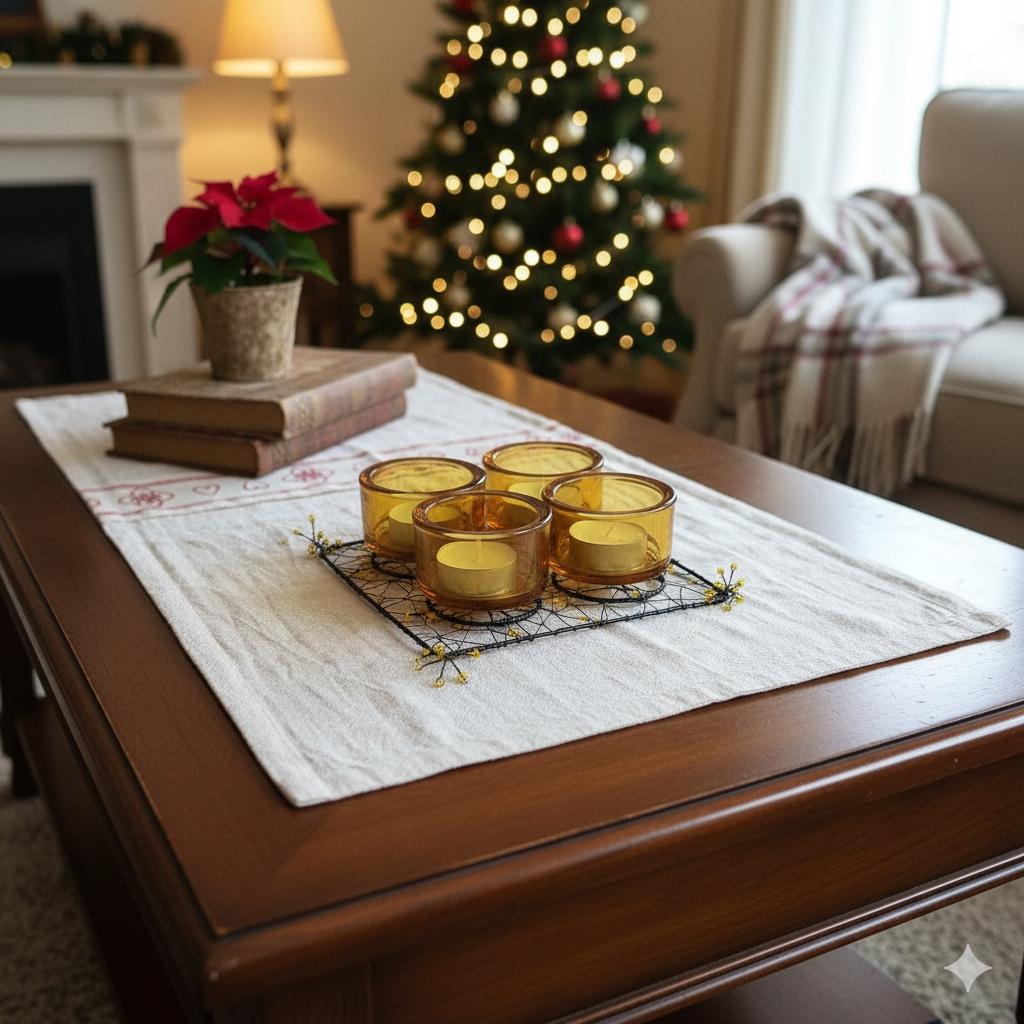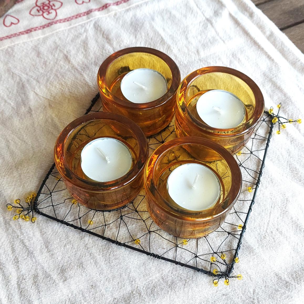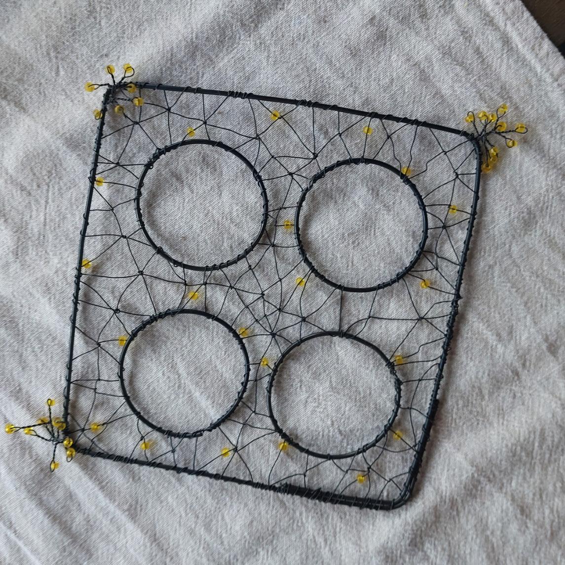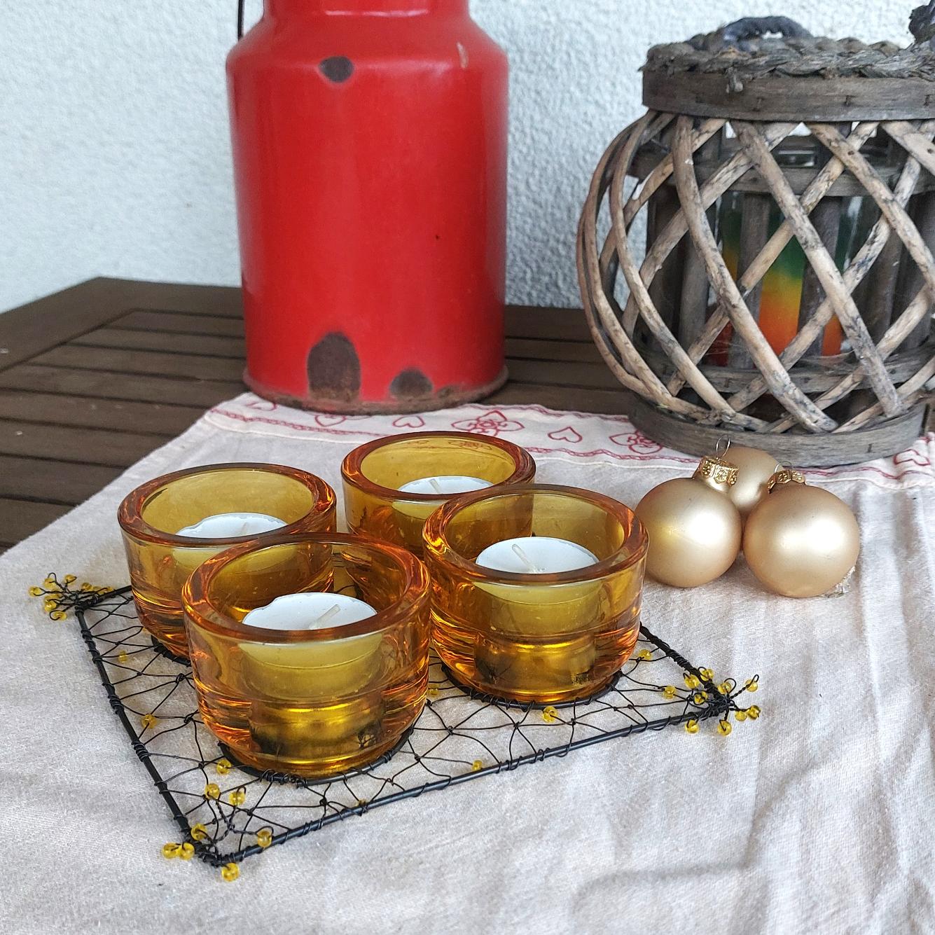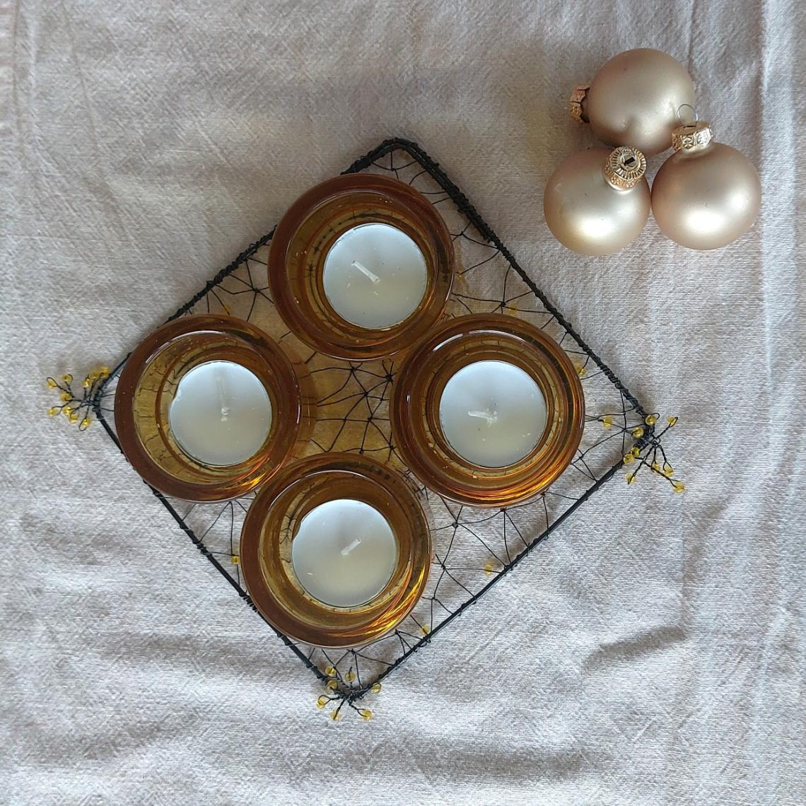 Originální adventní svícen - drátovaná podložka pro 4 skleněné svícny (jsou součástí). Podložka je vypletená a ozdobená skleněnými korálky ve stejné barvě. Kombinace drátu a skleněných korálků působí elegantně a nadčasově. Ideální dekorace pro moderní, rustikální i tradiční interiér, která během adventu vytvoří příjemnou a hřejivou atmosféru.