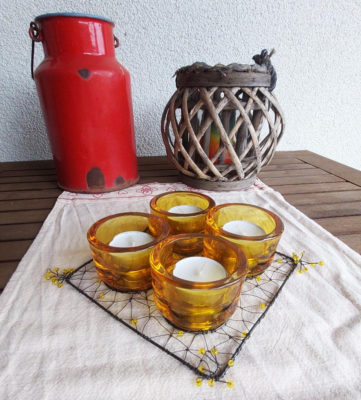 Materiál: ocelový drát, skleněné korálky, skleněné svícny