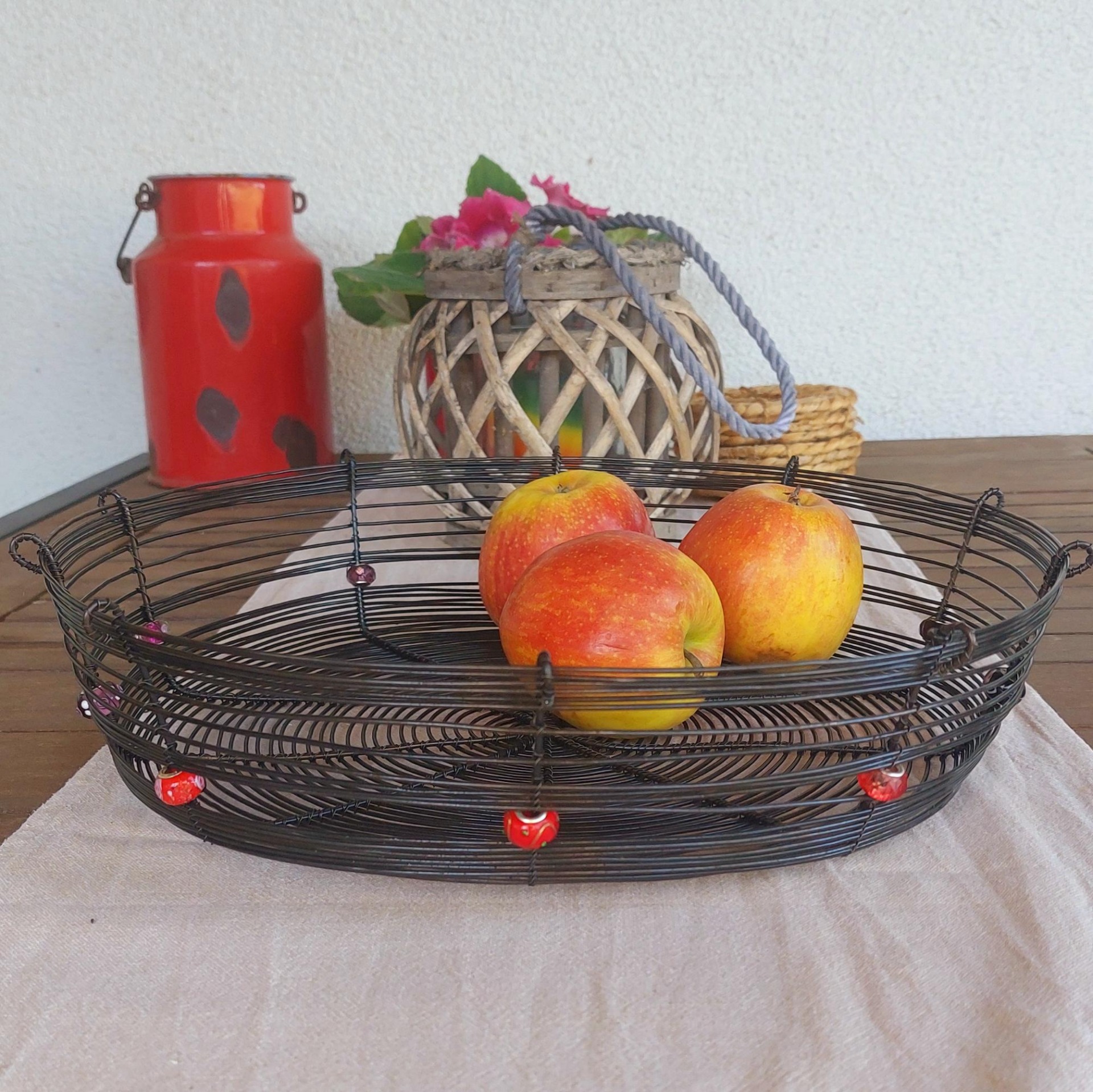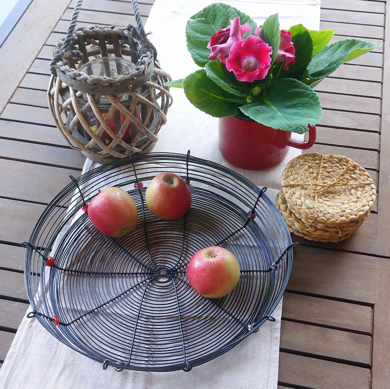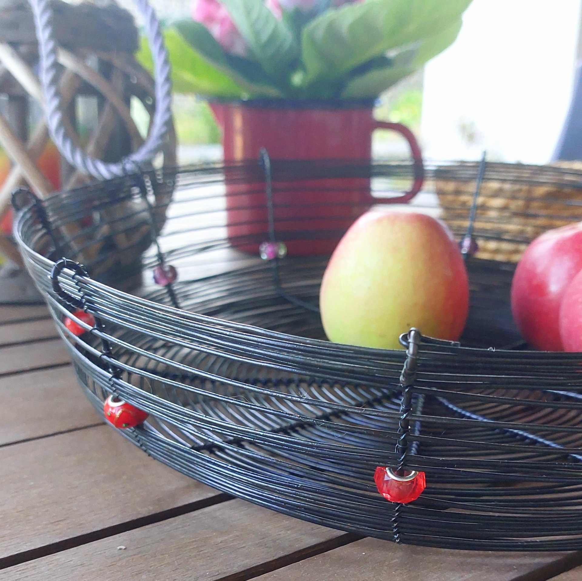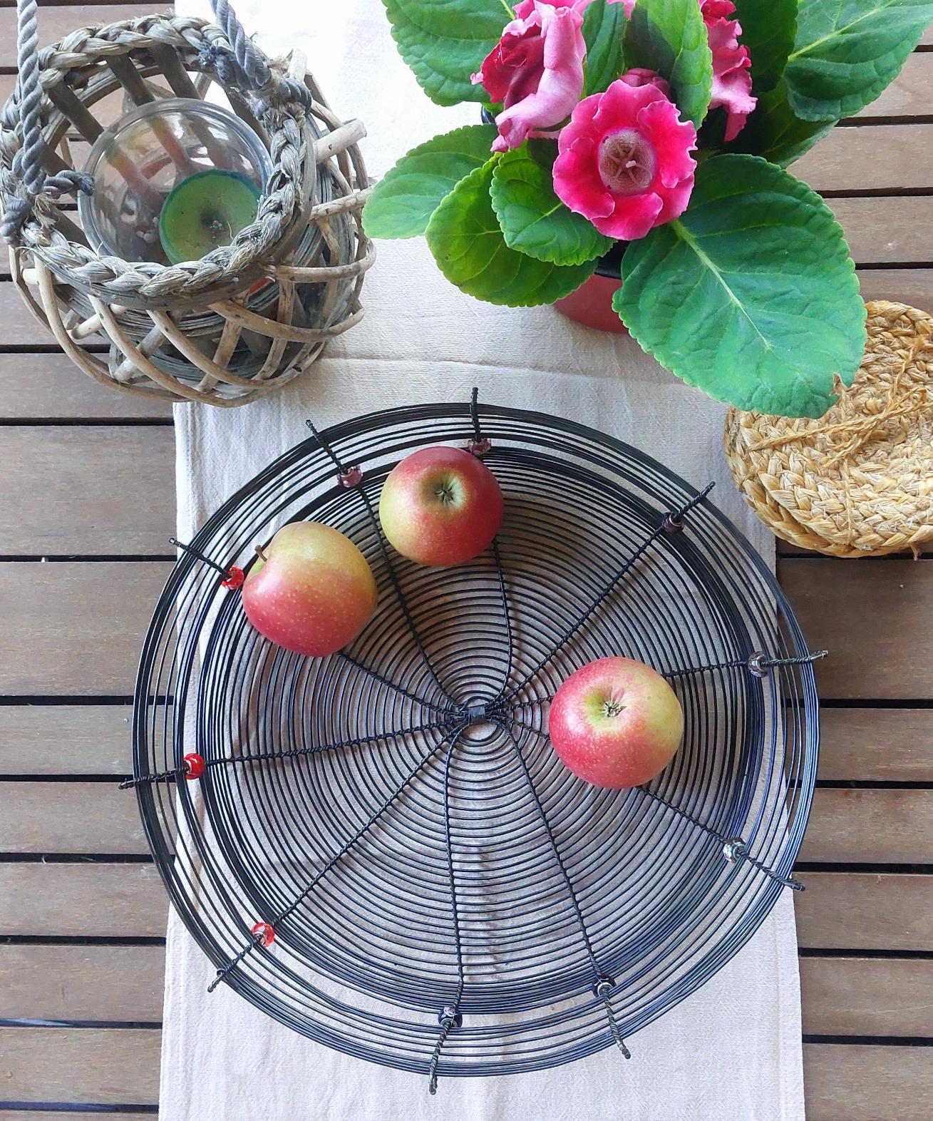 Velká a pevná drátovaná ošatka vyrobená ručně tradiční drátenickou technikou. Stylový a funkční doplněk do každého interiéru – skvěle poslouží na ovoce, ořechy nebo jako originální dekorace. Ozdobena deseti různobarevnými korálky v červených odstínech, které dodávají míse jedinečný charakter. Skvěle vynikne na stole, v kuchyni i na chalupě. Průměr 31 cm.