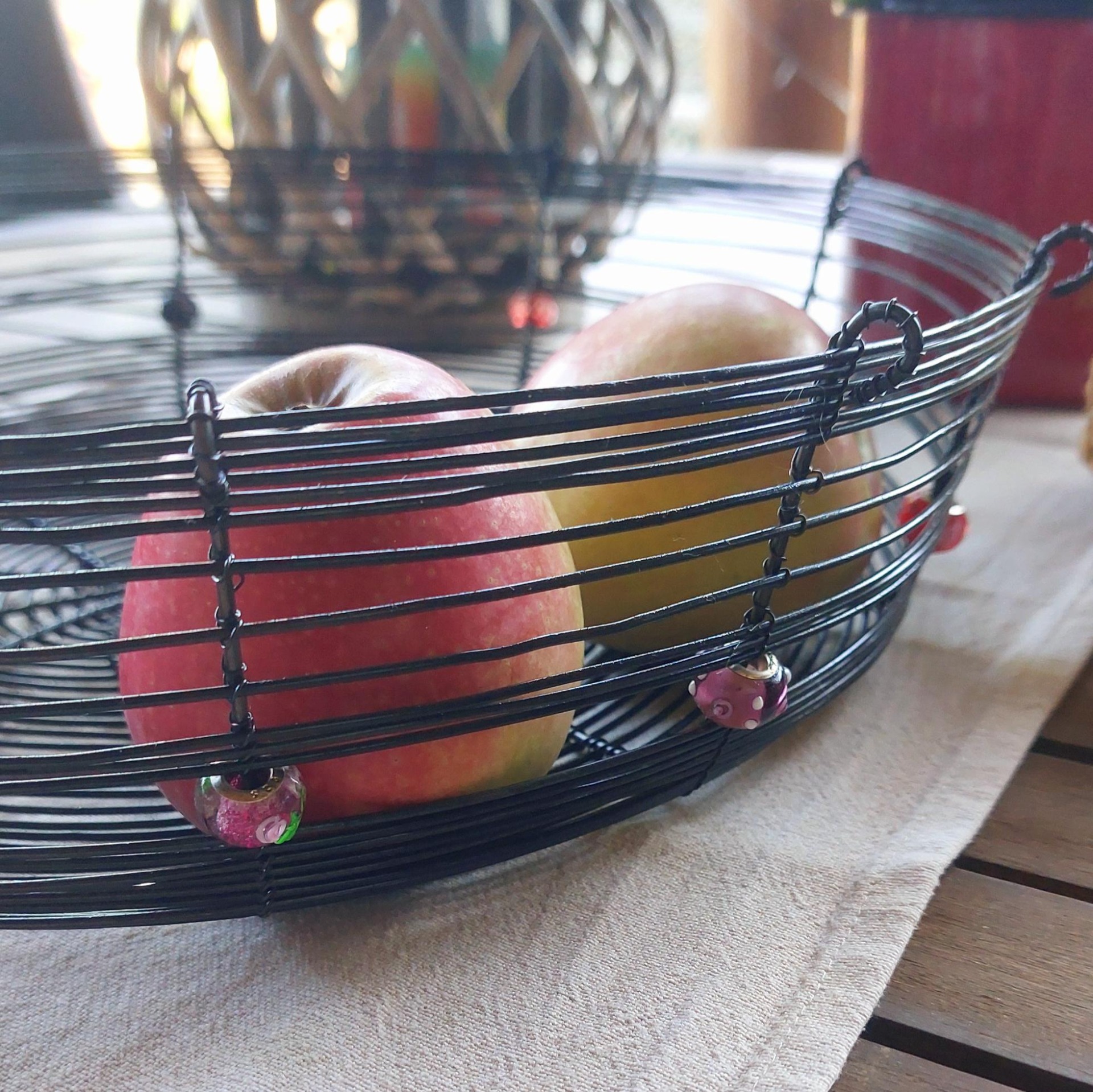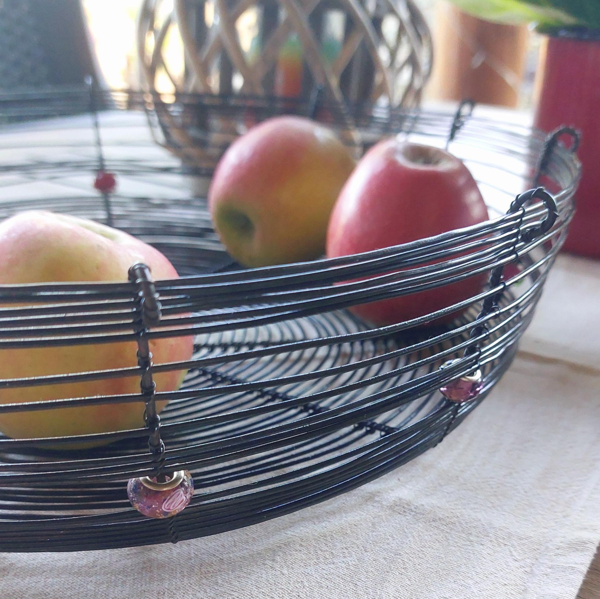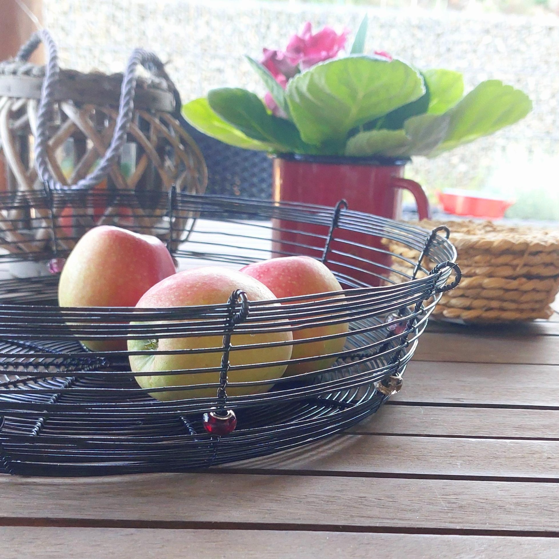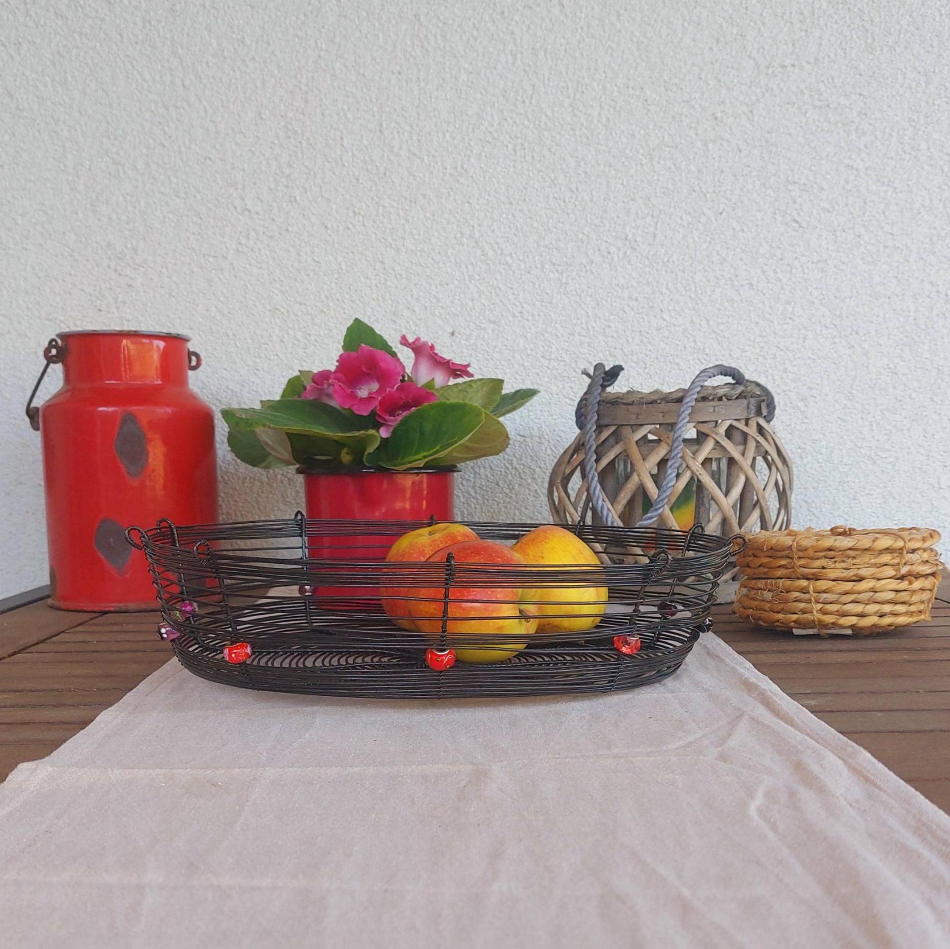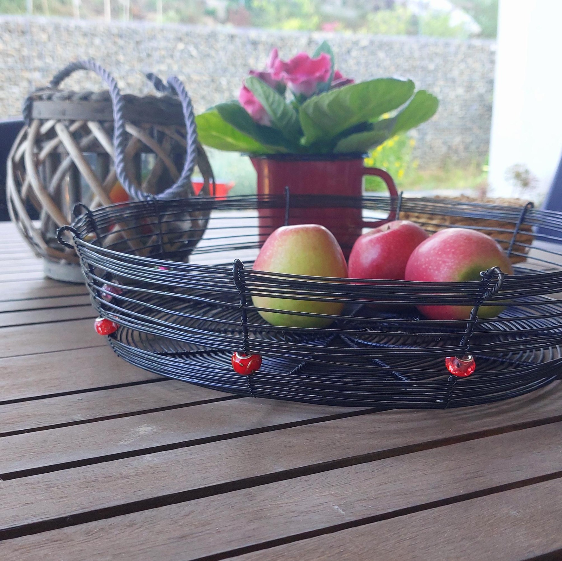 Velká a pevná drátovaná ošatka vyrobená ručně tradiční drátenickou technikou. Stylový a funkční doplněk do každého interiéru – skvěle poslouží na ovoce, ořechy nebo jako originální dekorace. Ozdobena deseti různobarevnými korálky v červených odstínech, které dodávají míse jedinečný charakter. Skvěle vynikne na stole, v kuchyni i na chalupě. Průměr 31 cm.