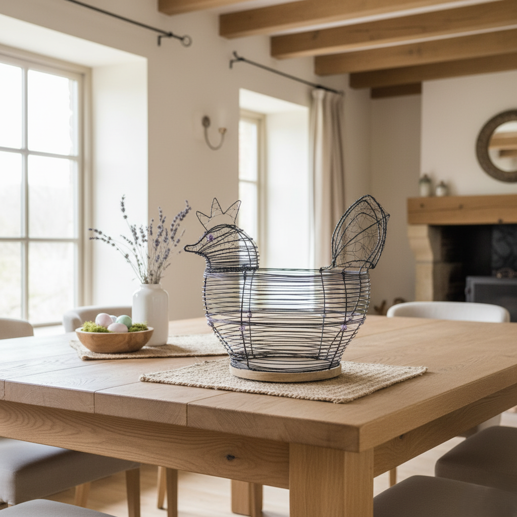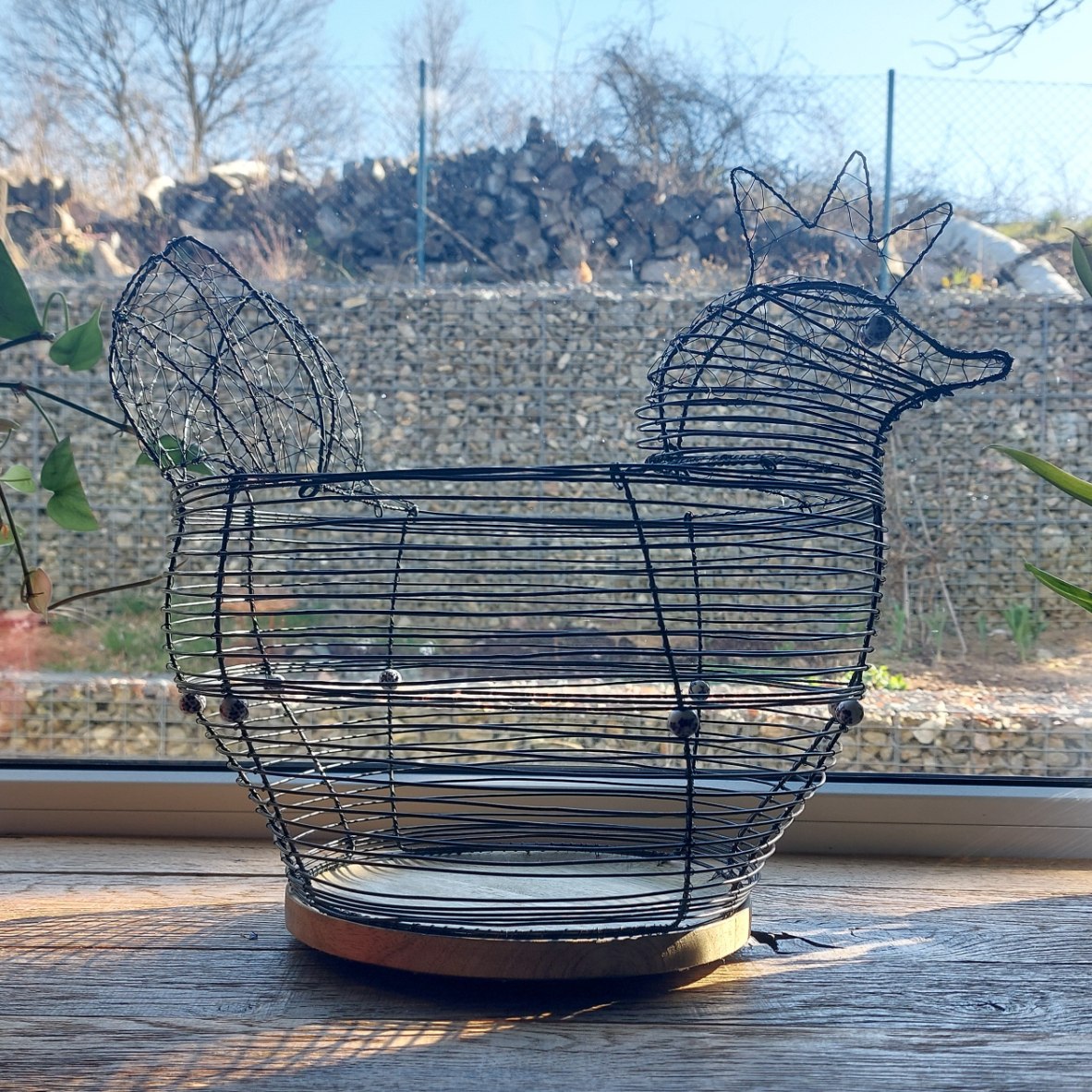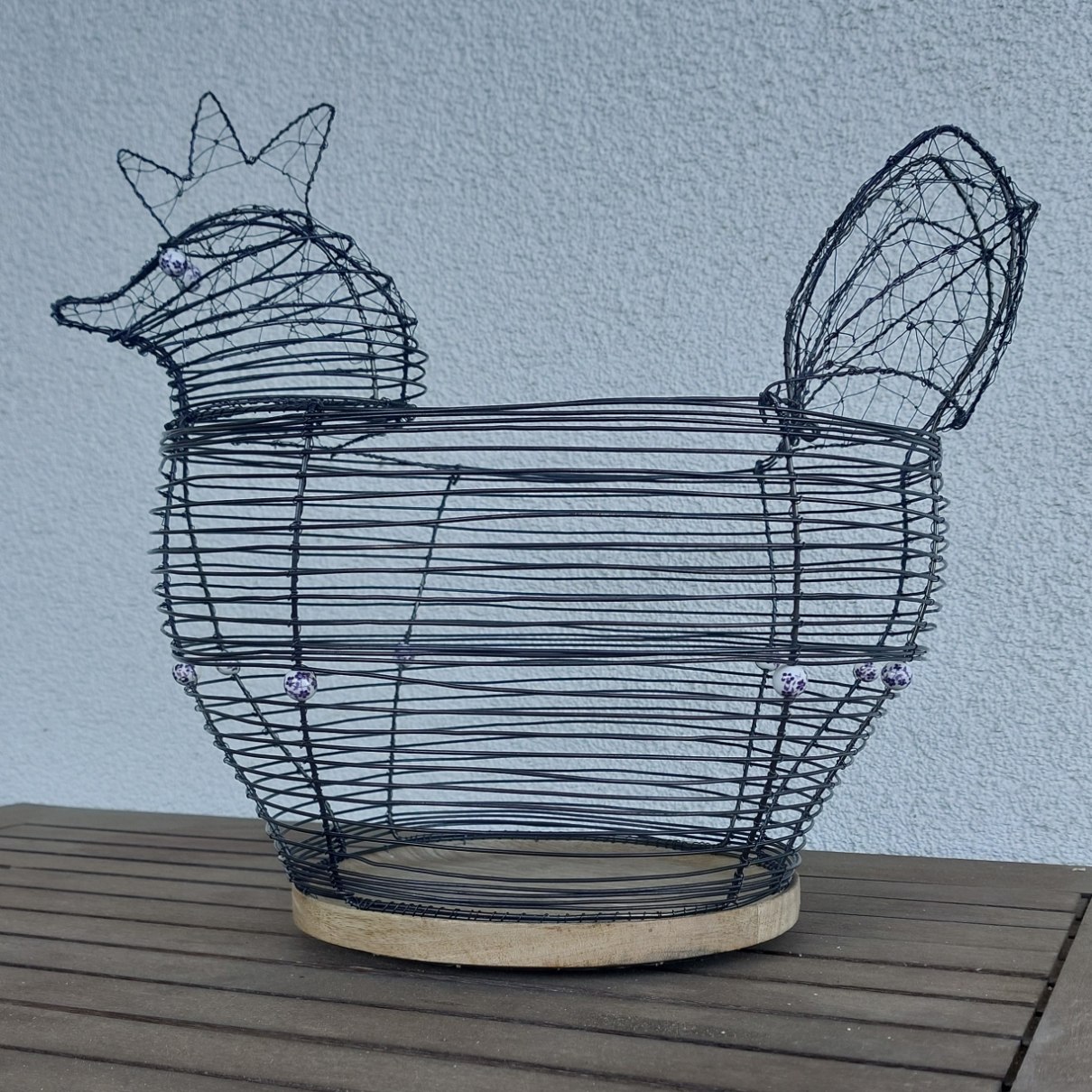 Originální a nepřehlédnutelná drátovaná mísa ve tvaru slepice, která vnese do vašeho domova kouzlo venkova a tradiční řemeslné práce. Dominantou je masivní dřevěné dno, které krásně kontrastuje s ručně tvarovaným drátem.