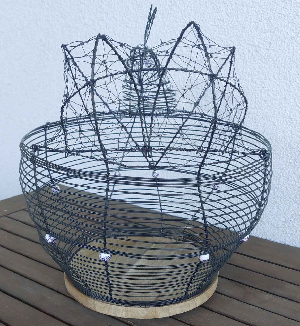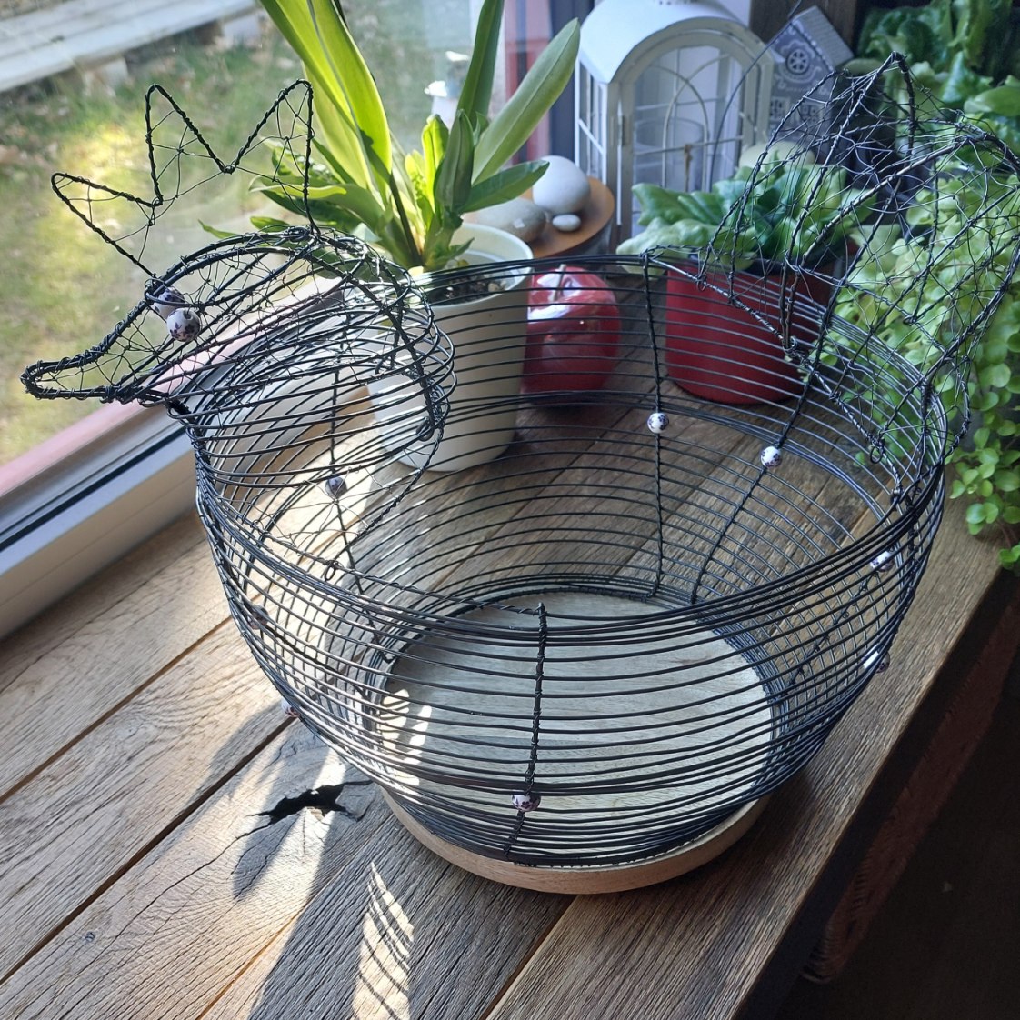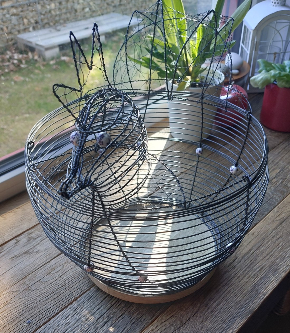 Originální a nepřehlédnutelná drátovaná mísa ve tvaru slepice, která vnese do vašeho domova kouzlo venkova a tradiční řemeslné práce. Dominantou je masivní dřevěné dno, které krásně kontrastuje s ručně tvarovaným drátem.