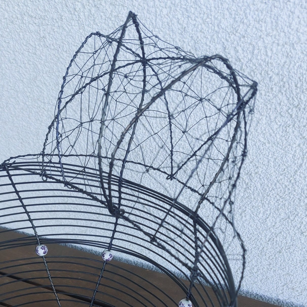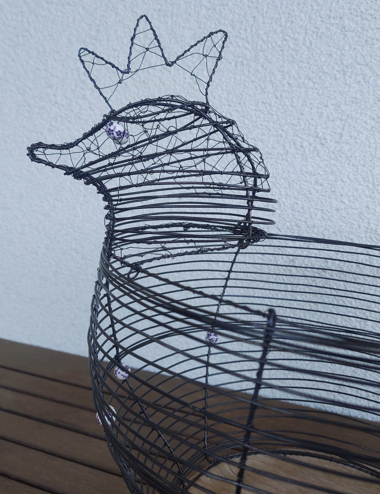Mísa je vyrobena klasickým drátenickým opletem. Detailně zpracovaná hlava i ocas dodávají výrobku jedinečný charakter – ocas je navíc vypleten do dekorativního hvězdicového vzoru (viz foto). Keramické korálky zdobí nejen tělo, ale tvoří i oči slepice.