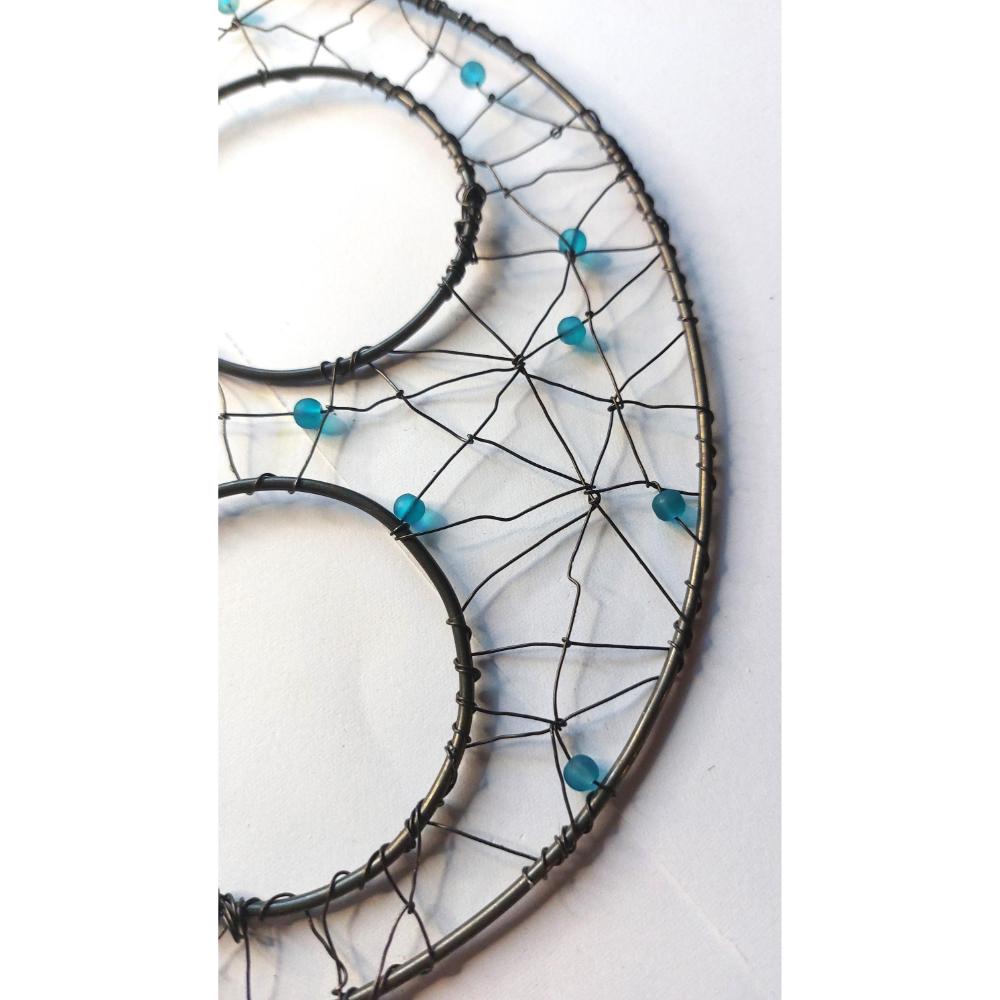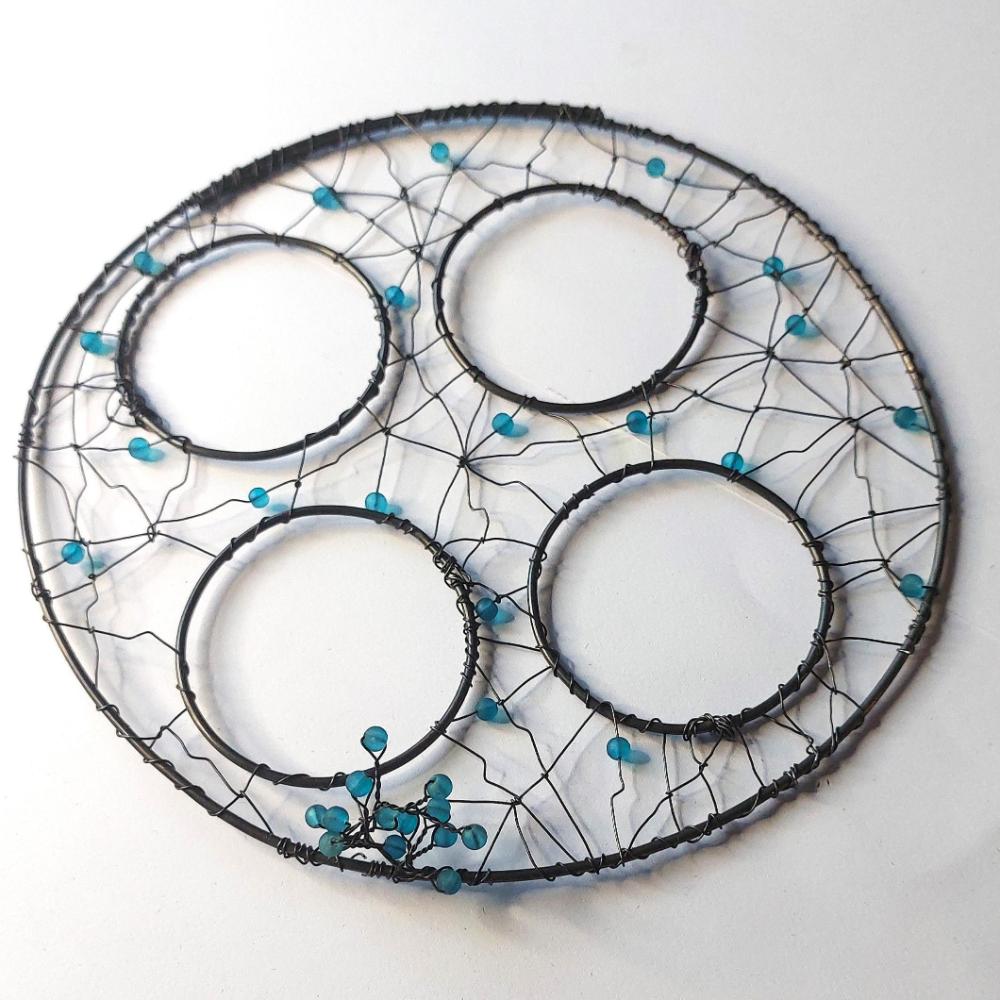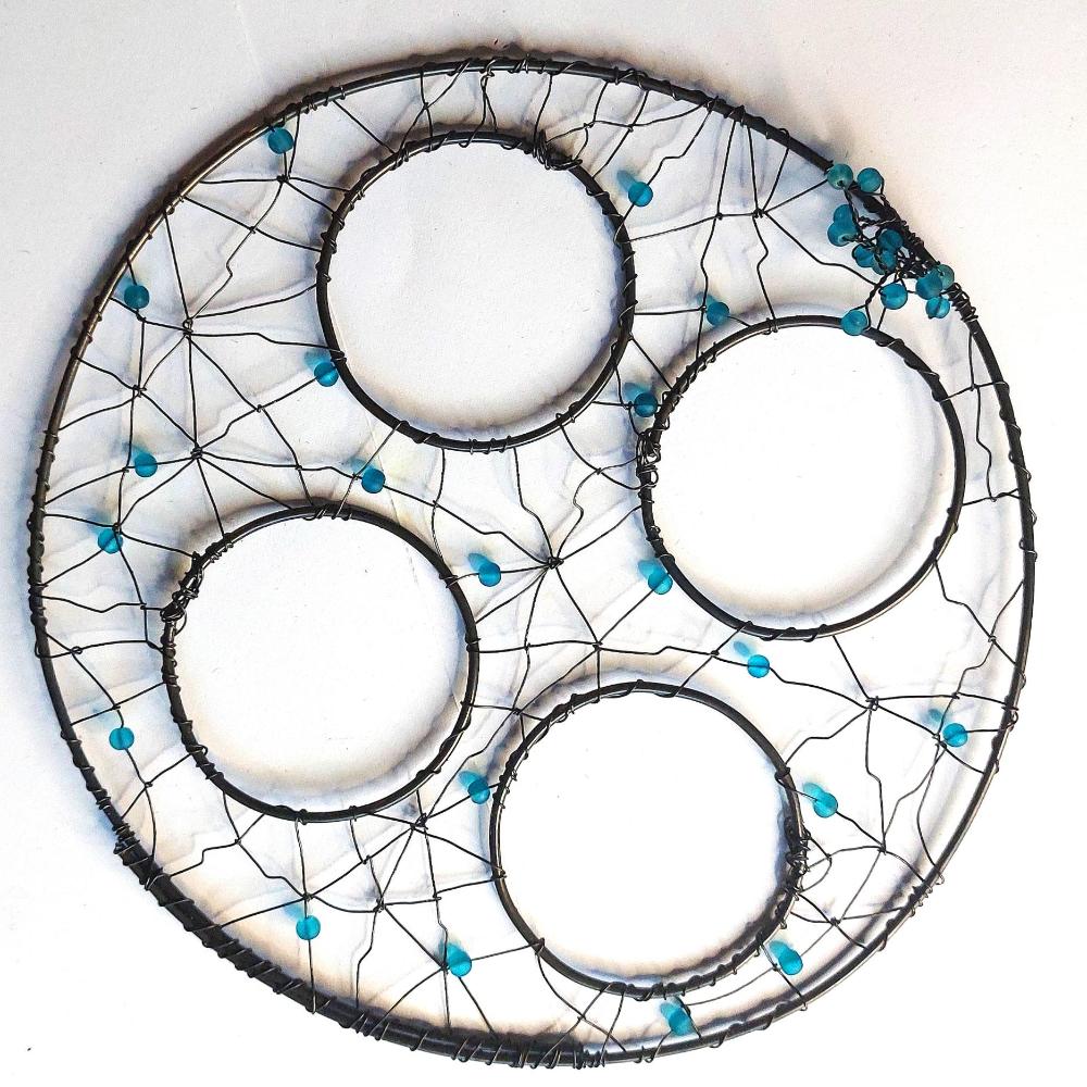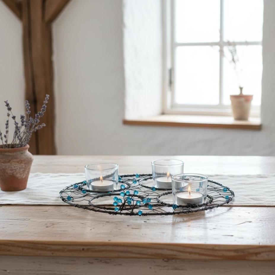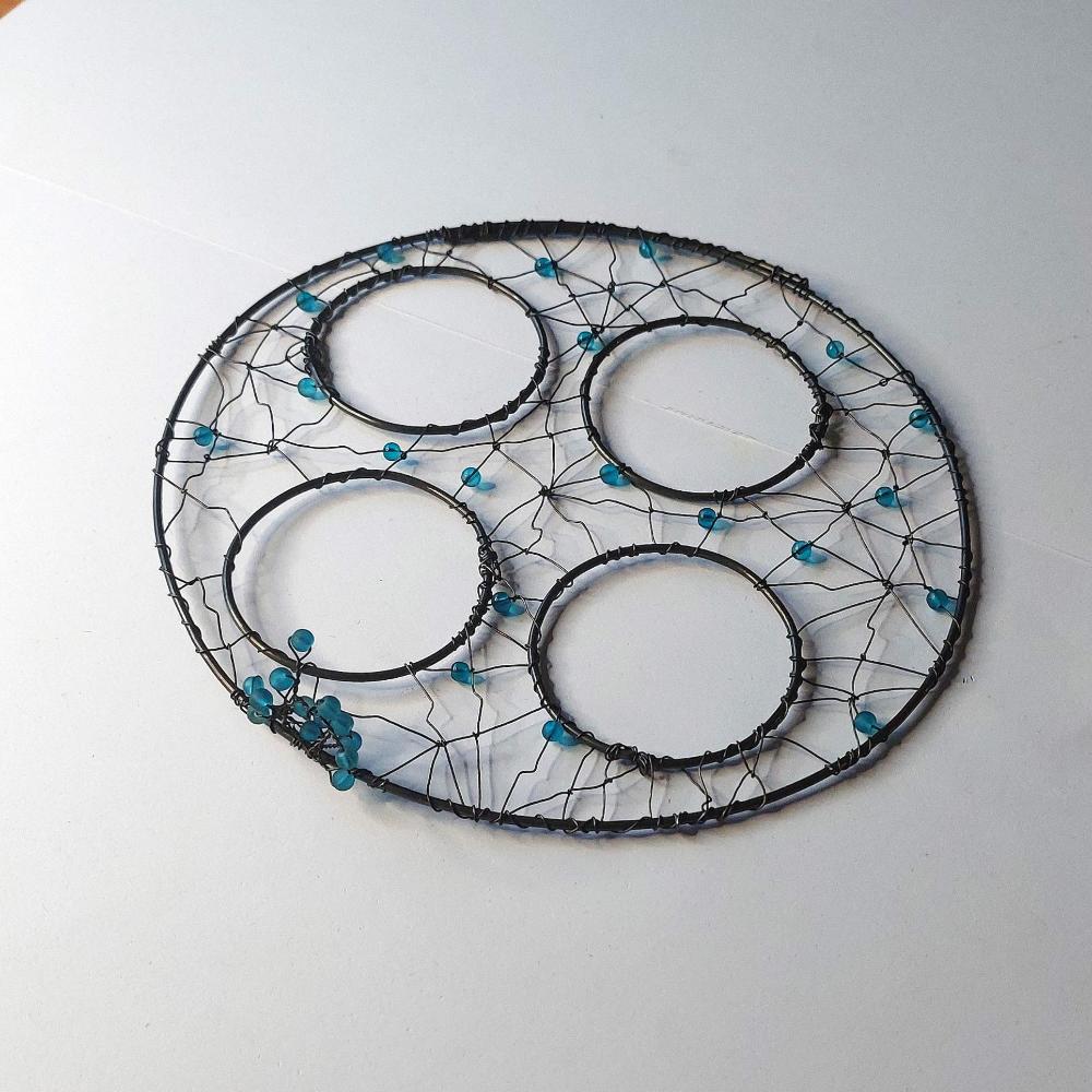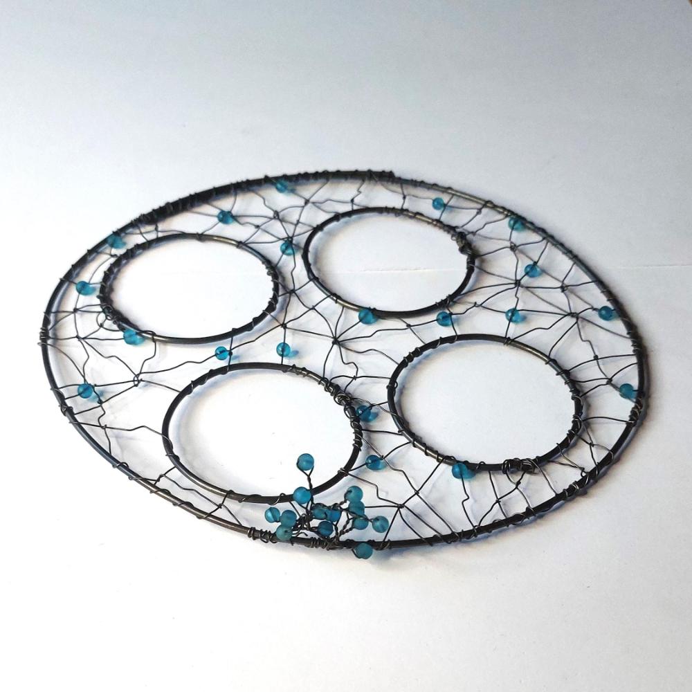 Ručně drátovaná podložka pr adventní svícen s otvory pro čtyři skleničky (nejsou součást výrobku). Podložka je kruhová, propletená a doplněná tyrkysovými korálky. Barva korálků může být dle přání. Originální dekorace vhodná do moderní i rustikální domácnosti.