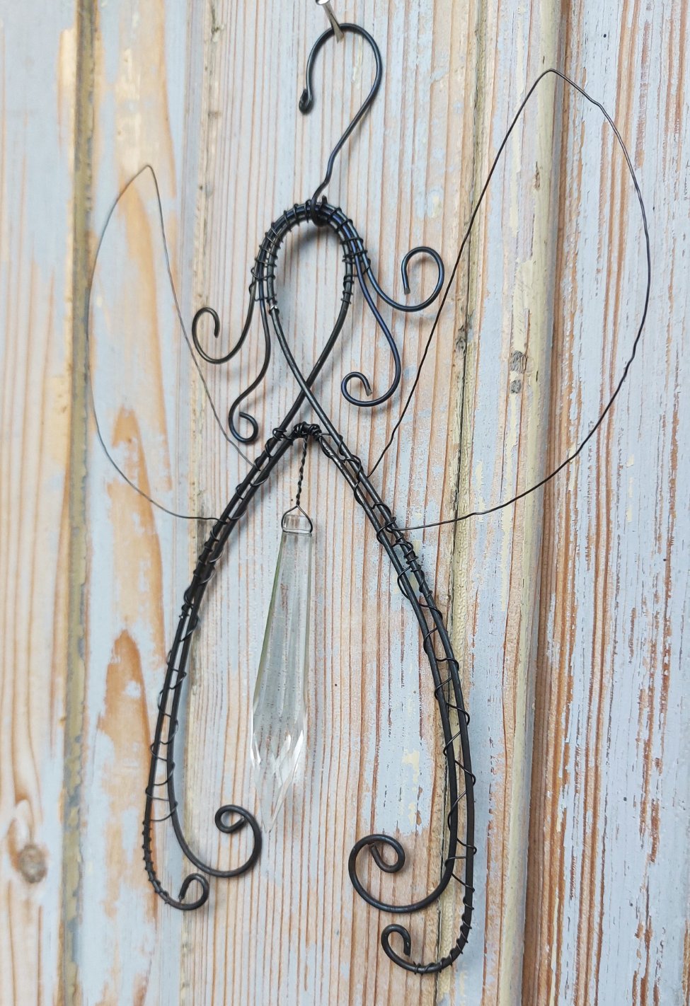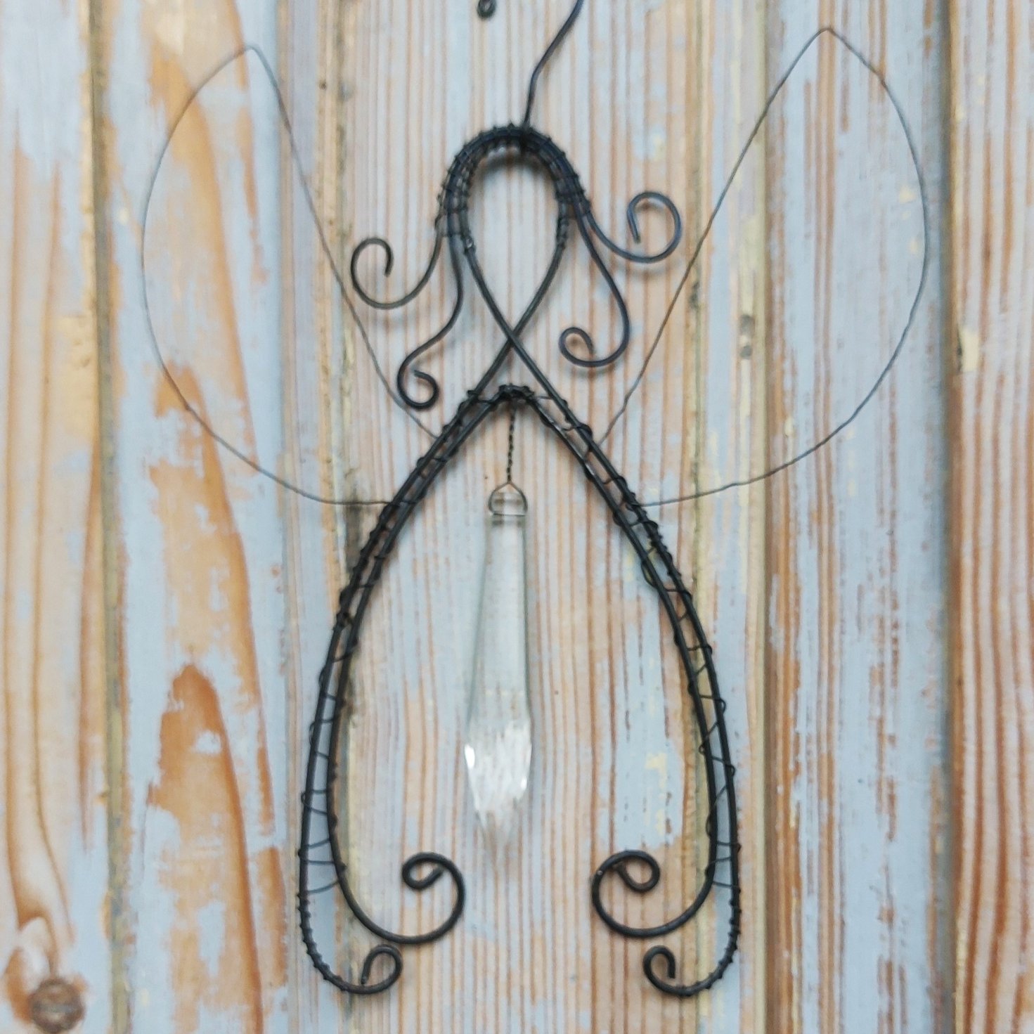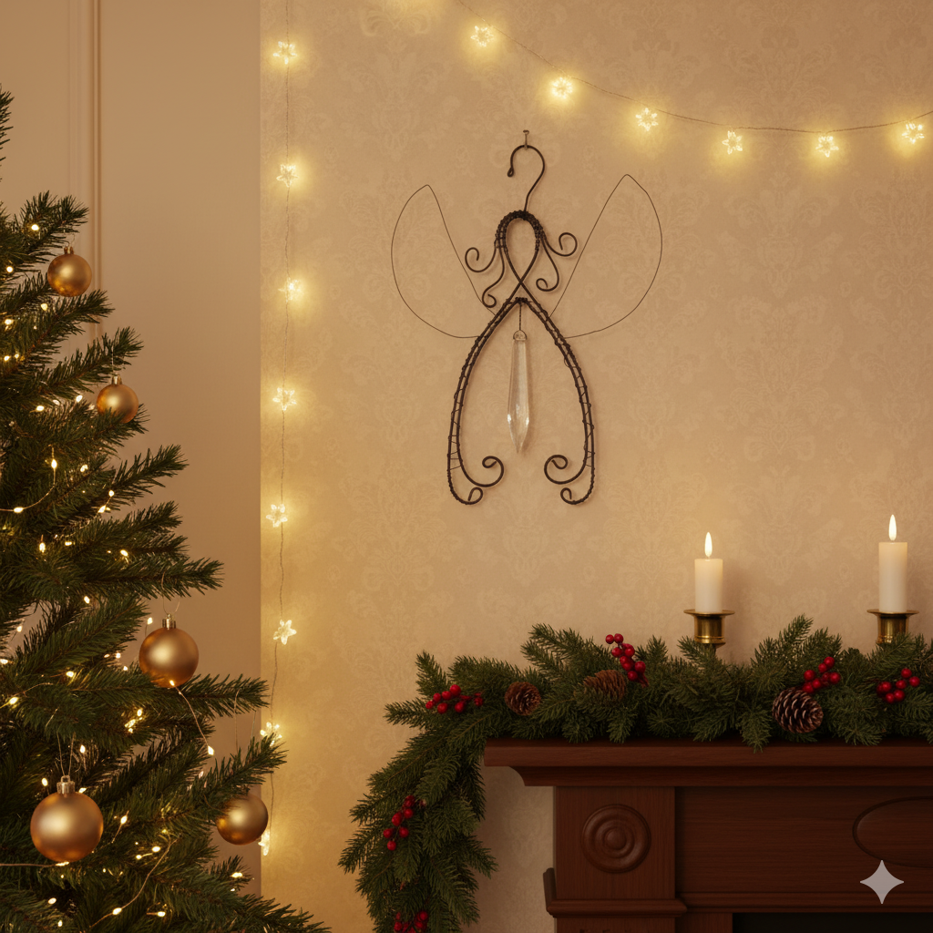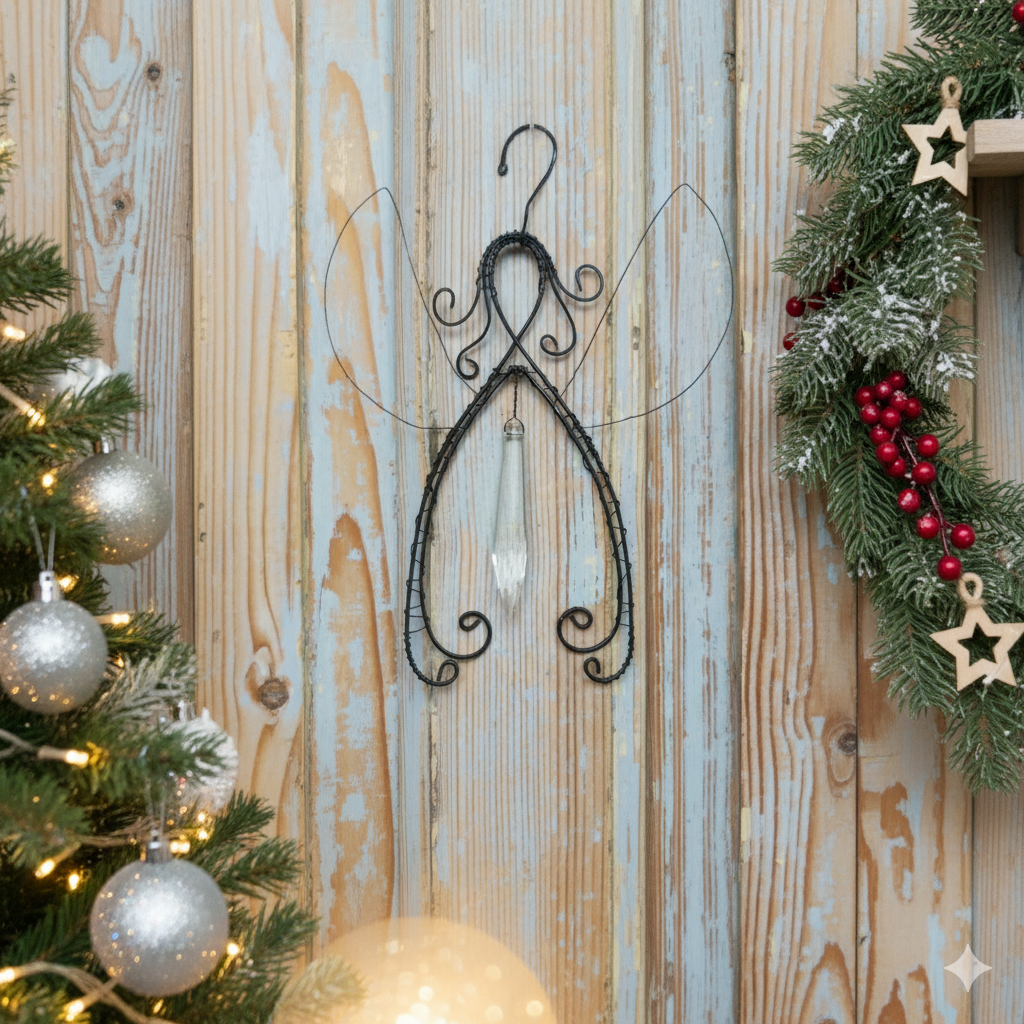 Anděl je ručně vyroben z černého železného drátu a doplněn o broušený skleněný ověs, který krásně odráží světlo. Díky svému minimalistickému vzhledu se hodí jak k tradičnímu, tak k modernímu interiéru.