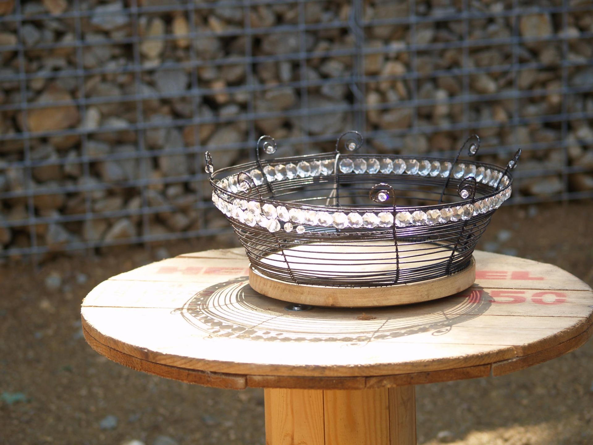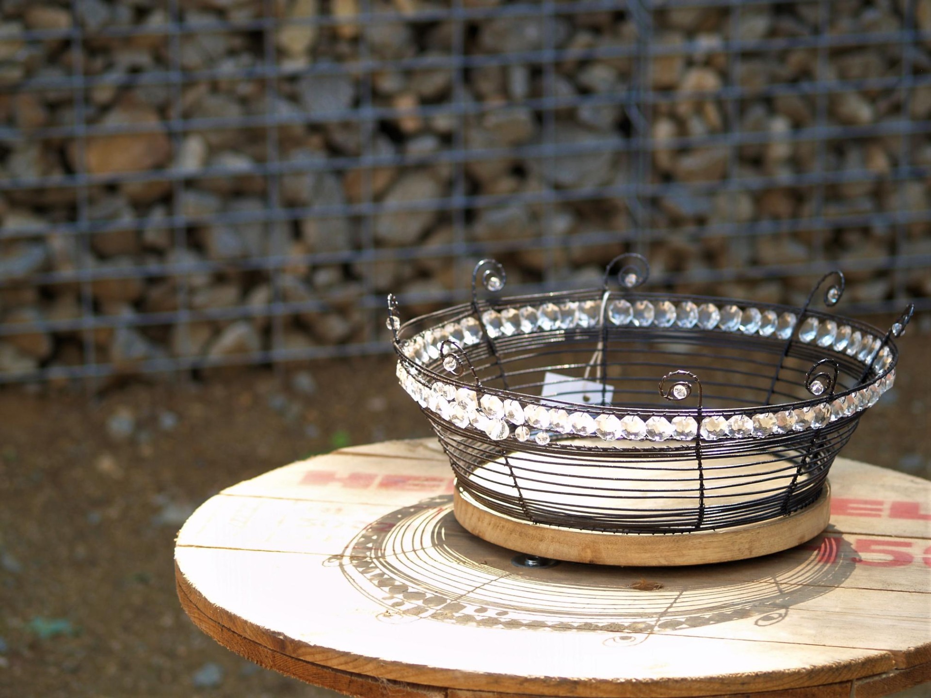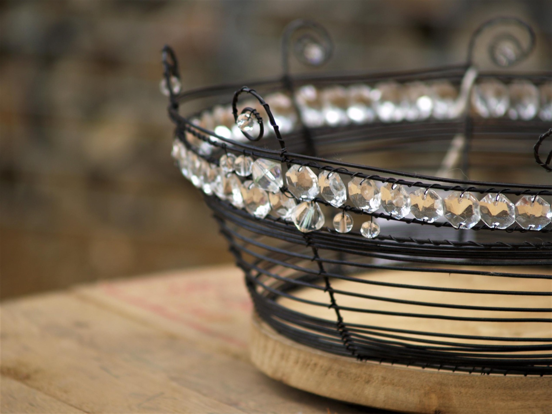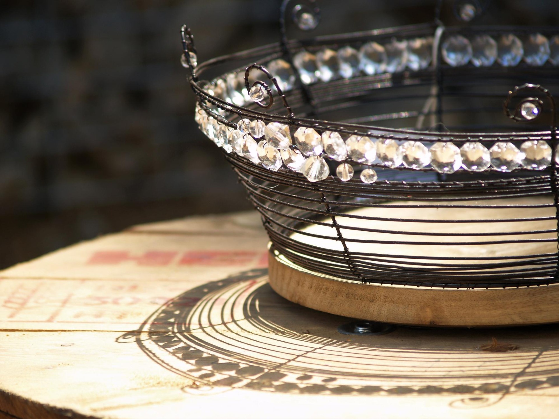 Mísa drátovaná z černého drátu s dřevěným dnem.