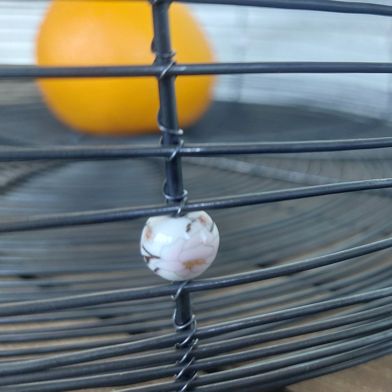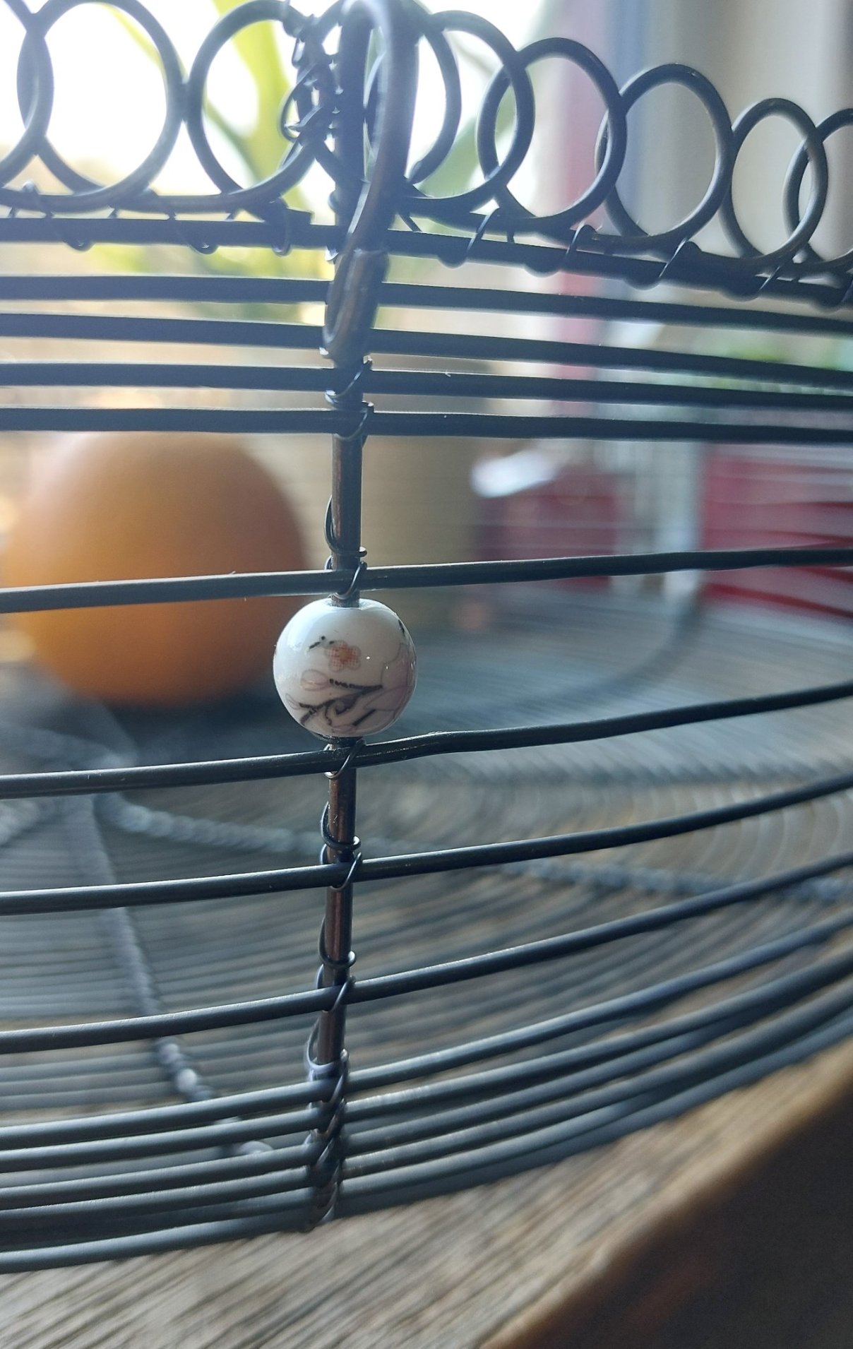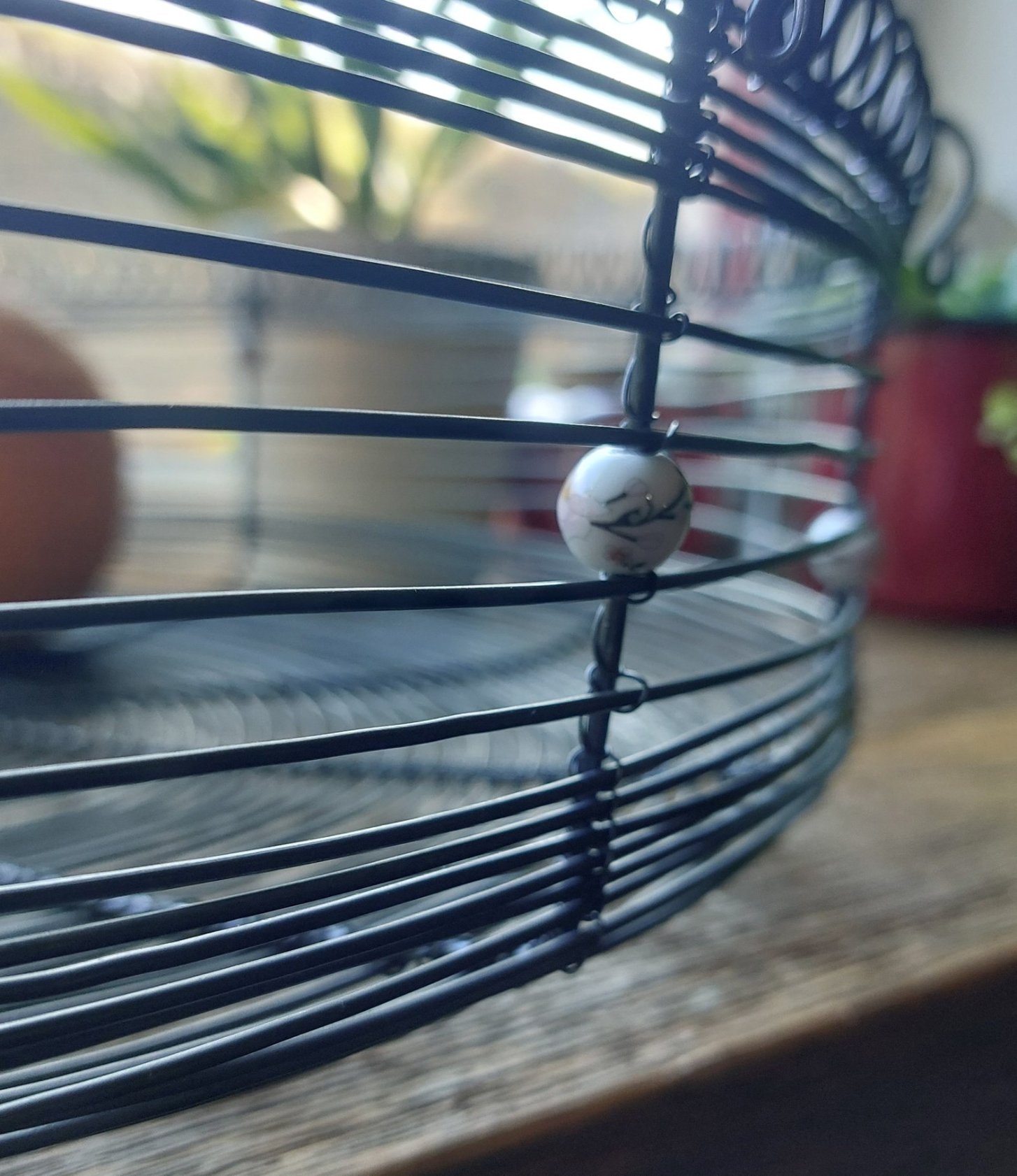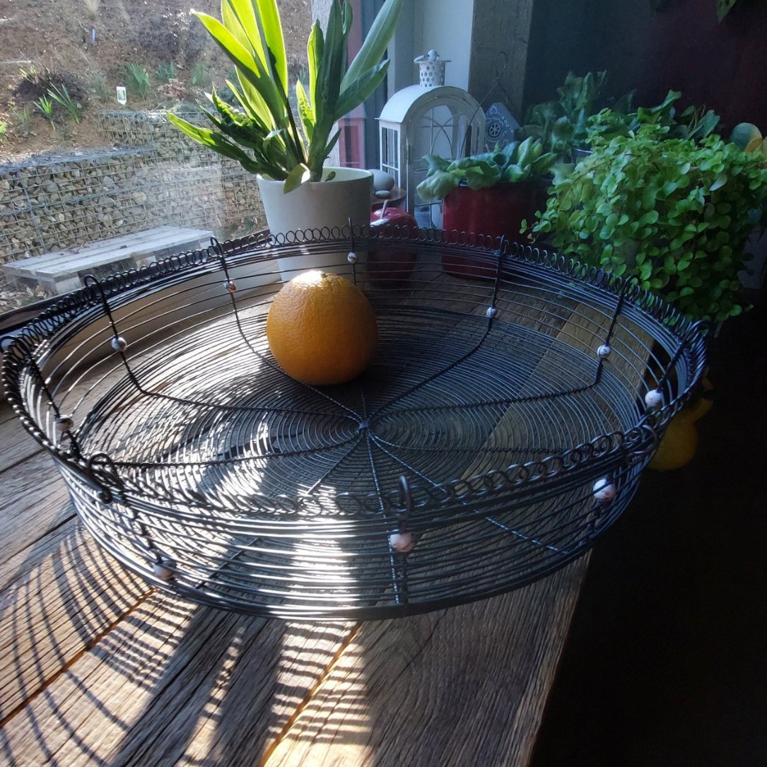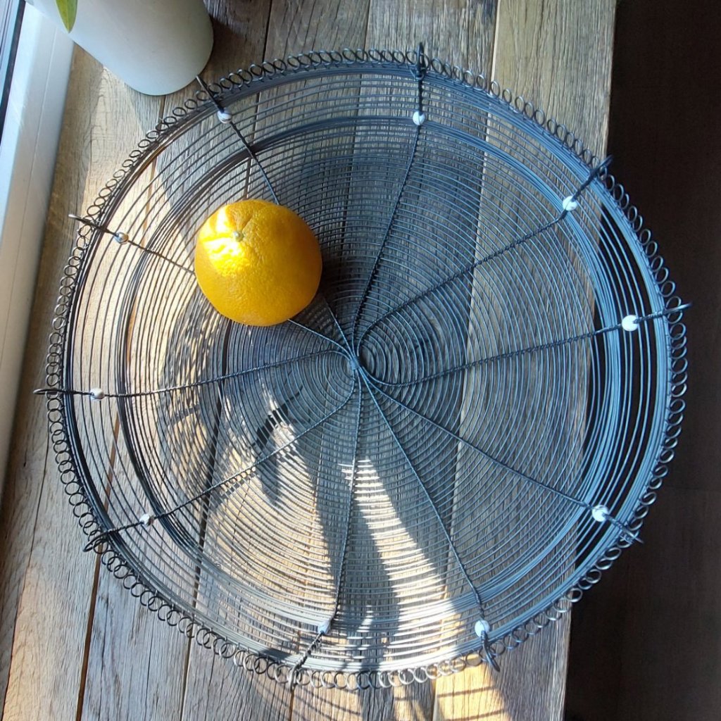 Je ručně vyrobená z černého žíhaného drátu a doplněná jemnými keramickými korálky s nádechem do fialova. Díky průměru 40 cm a výšce 10 cm jde opravdu o výrazný kousek – ideální jako dekorace na stůl, kuchyňskou linku nebo komodu.