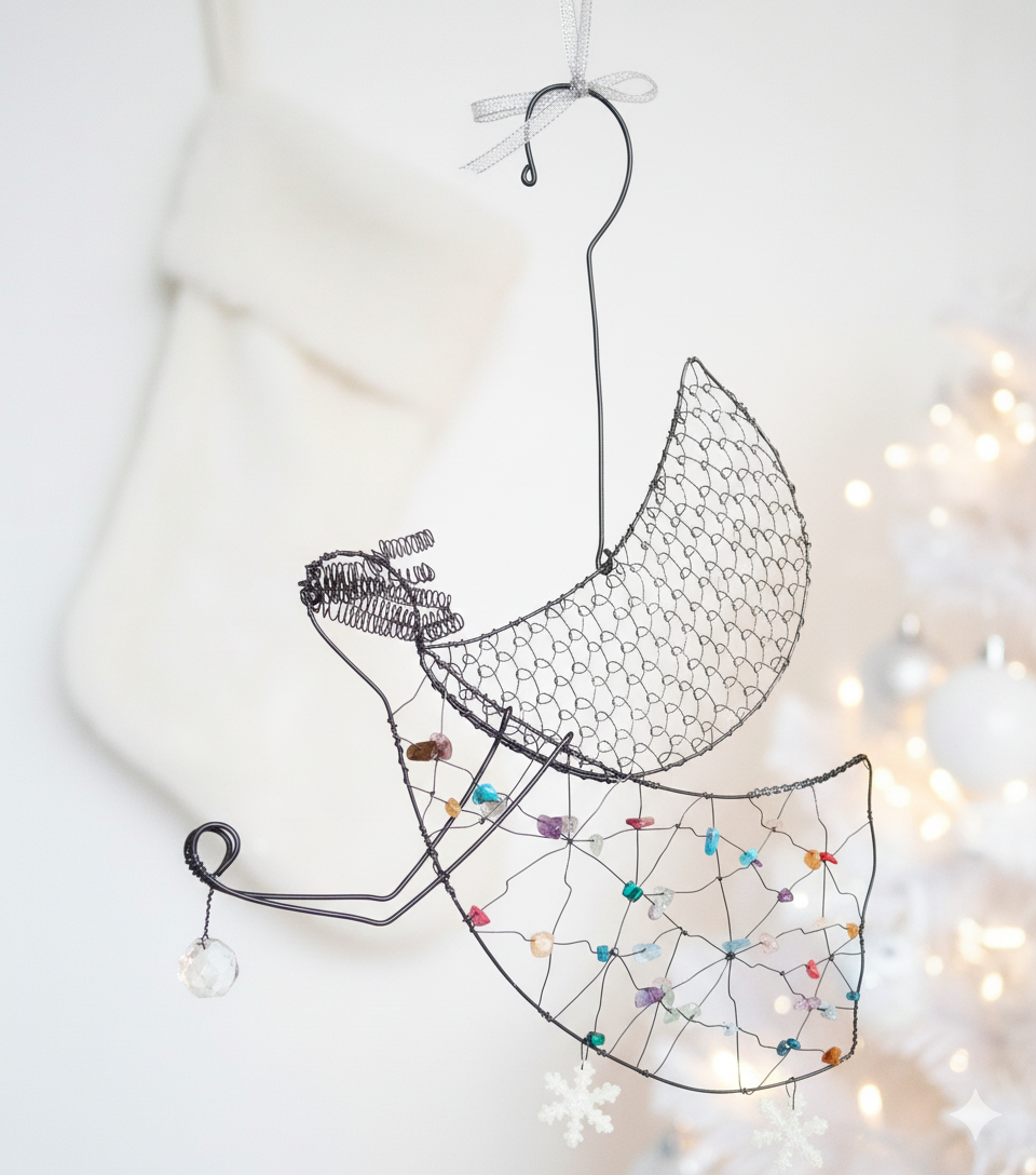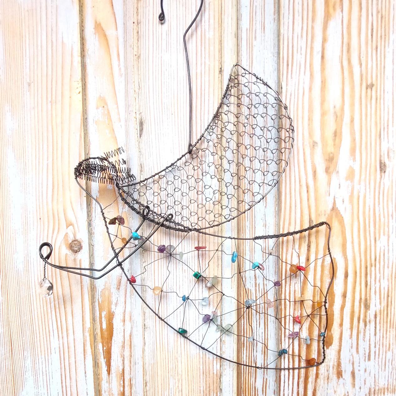 Tento ručně vyrobený anděl je vytvořen z černého drátu a ozdoben různými úlomky přírodních minerálů - ametyst, růženín, turmalín, citrín, zelený avanturín, tyrkys, červený avanturín, červený korál, fluorit, granát, jahodový křemen, apatit, malachit (anděl nemusí obsahovat všechny). Jeho tělo je vypleteno drátem a minerály, které mu dodávají jedinečný vzhled i energii. Křídla jsou vypletena jemným smyčkovým výpletem.